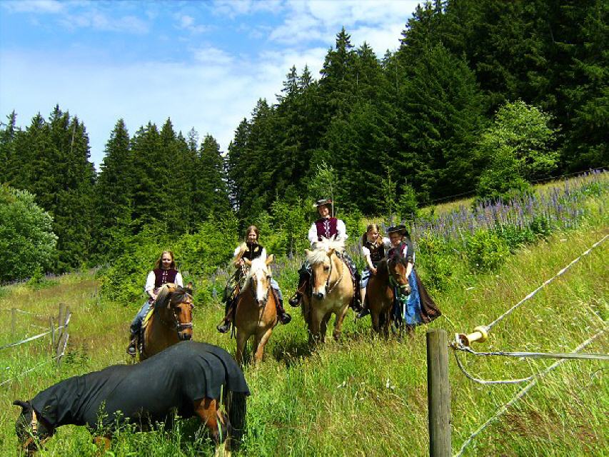 Für unsere reitbegeisterten Gäste stehen unsere braven und ruhigen Norweger Tomte, Hretla, Hanns sowie unser Quarter Ray-Jack und noch das Exmoorpony Billy zur Verfügung. Sie sind sehr zuverlässig und daher auch für Anfänger und Kinder geeignet. Die Kleinsten können auf unserem kleinen Reitplatz an der Longe erste Runden drehen oder durch unseren schönen Schwarzwald geführt werden.